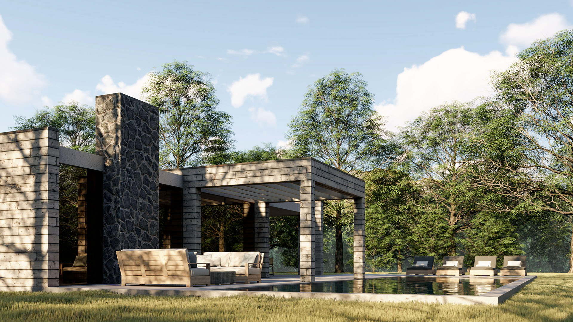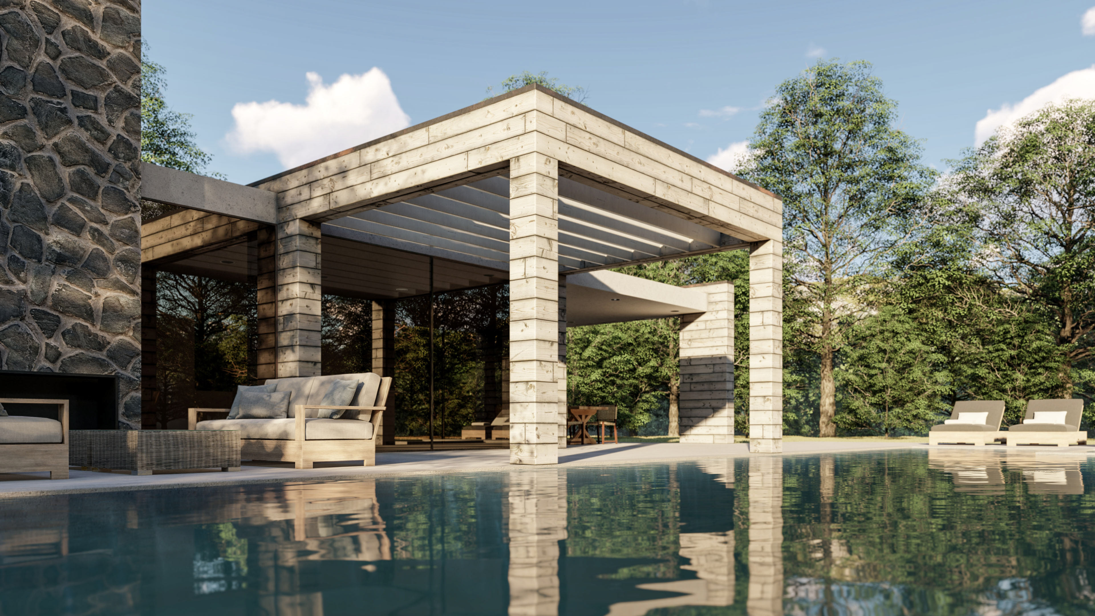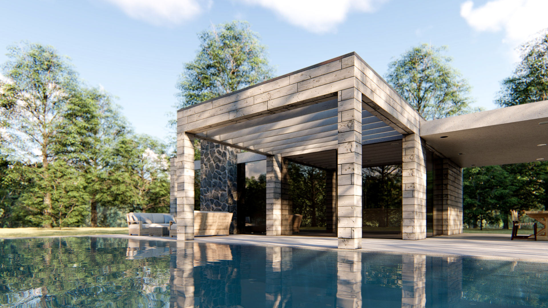 A set of computer generated images and short animation showcasing a pool house. Testing Lumion with SketchUp for real-time production.