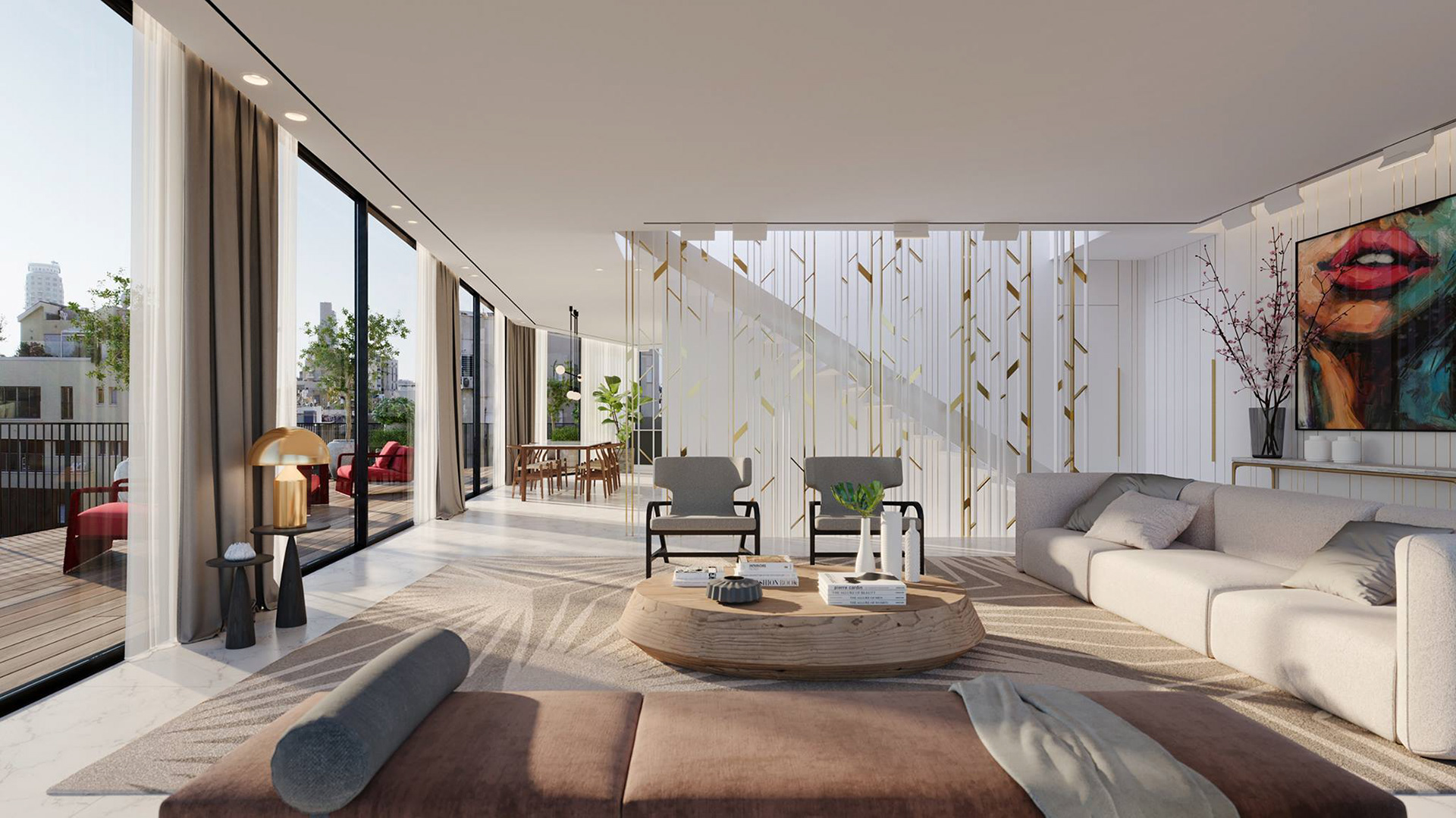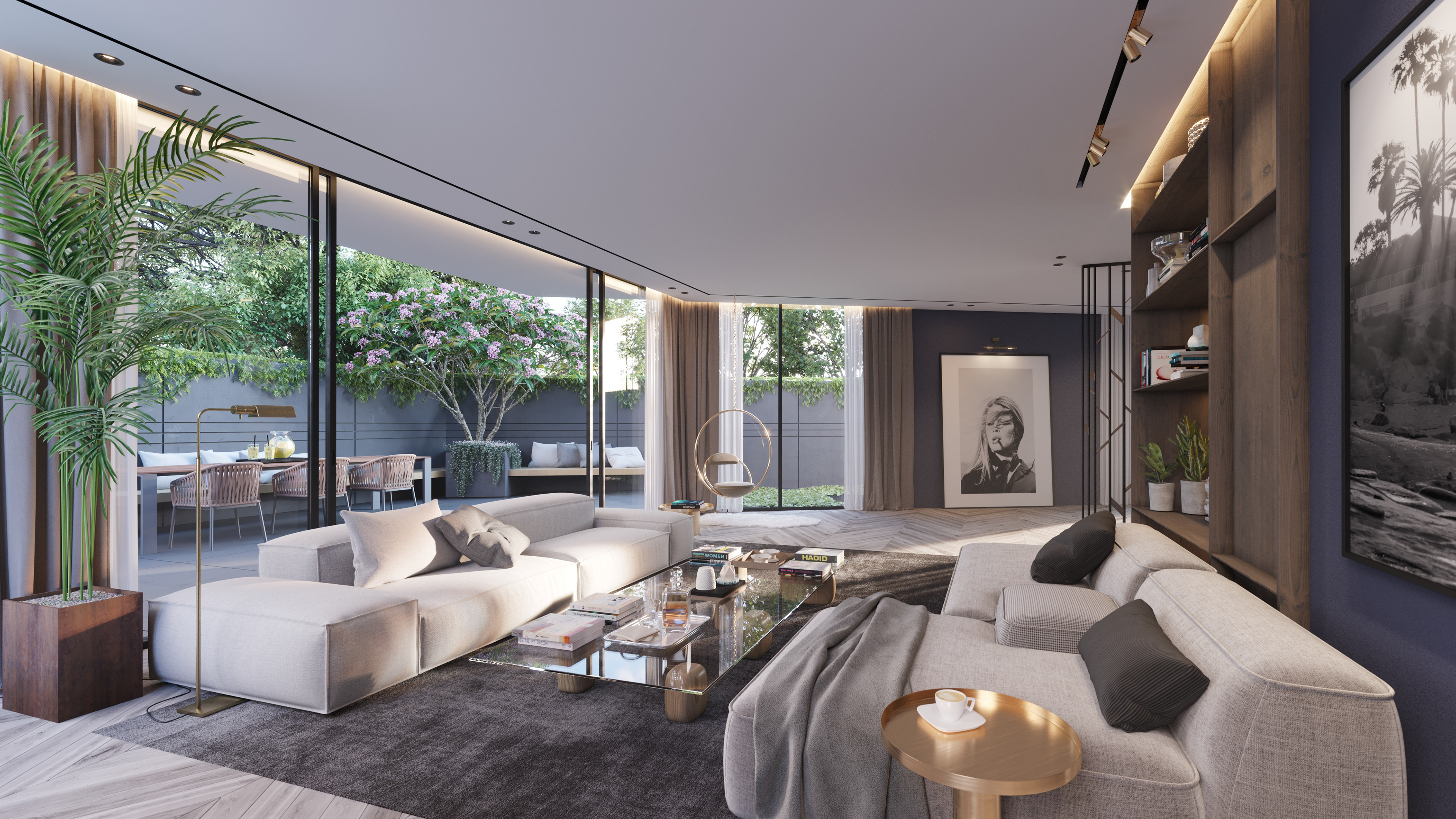 Interior Design & Architectural Visualization for a new residential project in Tel Aviv. Building designed by Bar Orian Architects for NOGA Group. Interior Design by BU Studio in collaboration with The Craft.