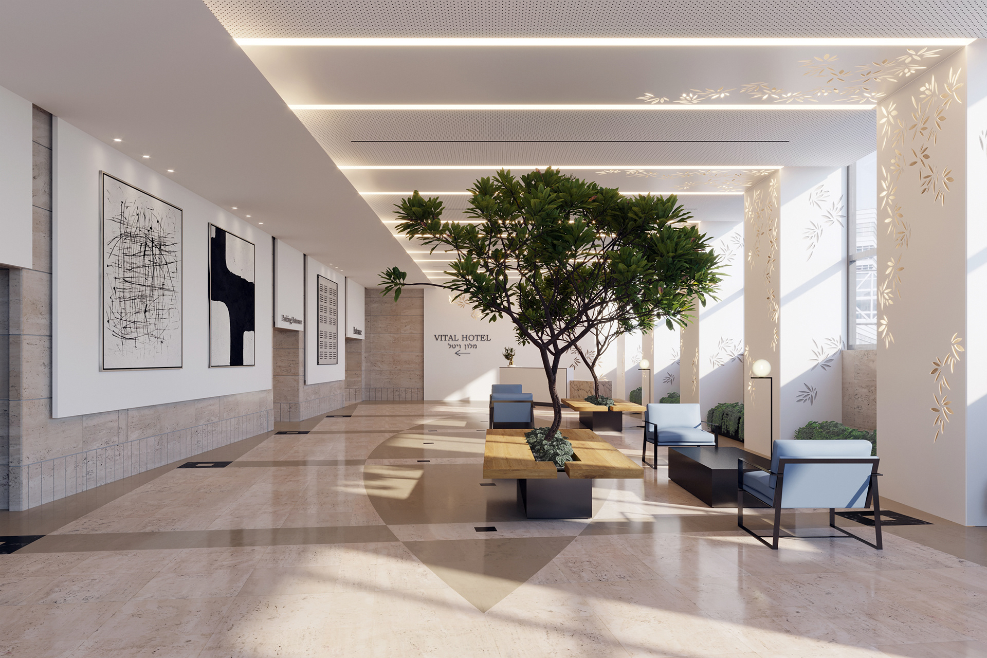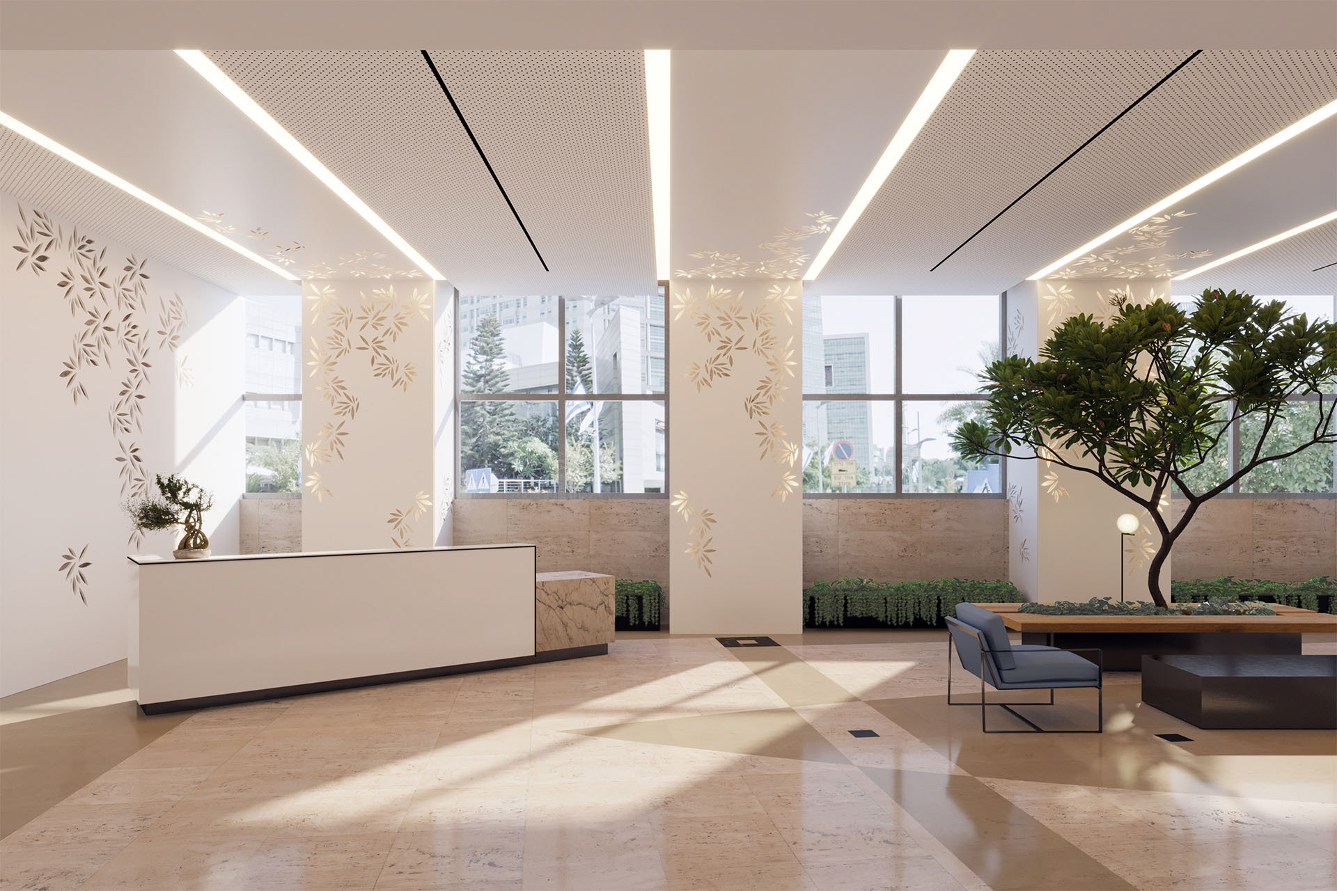 Interior Design Renders (CGI) for a renovation of the Weizmann Center Tower Lobby.